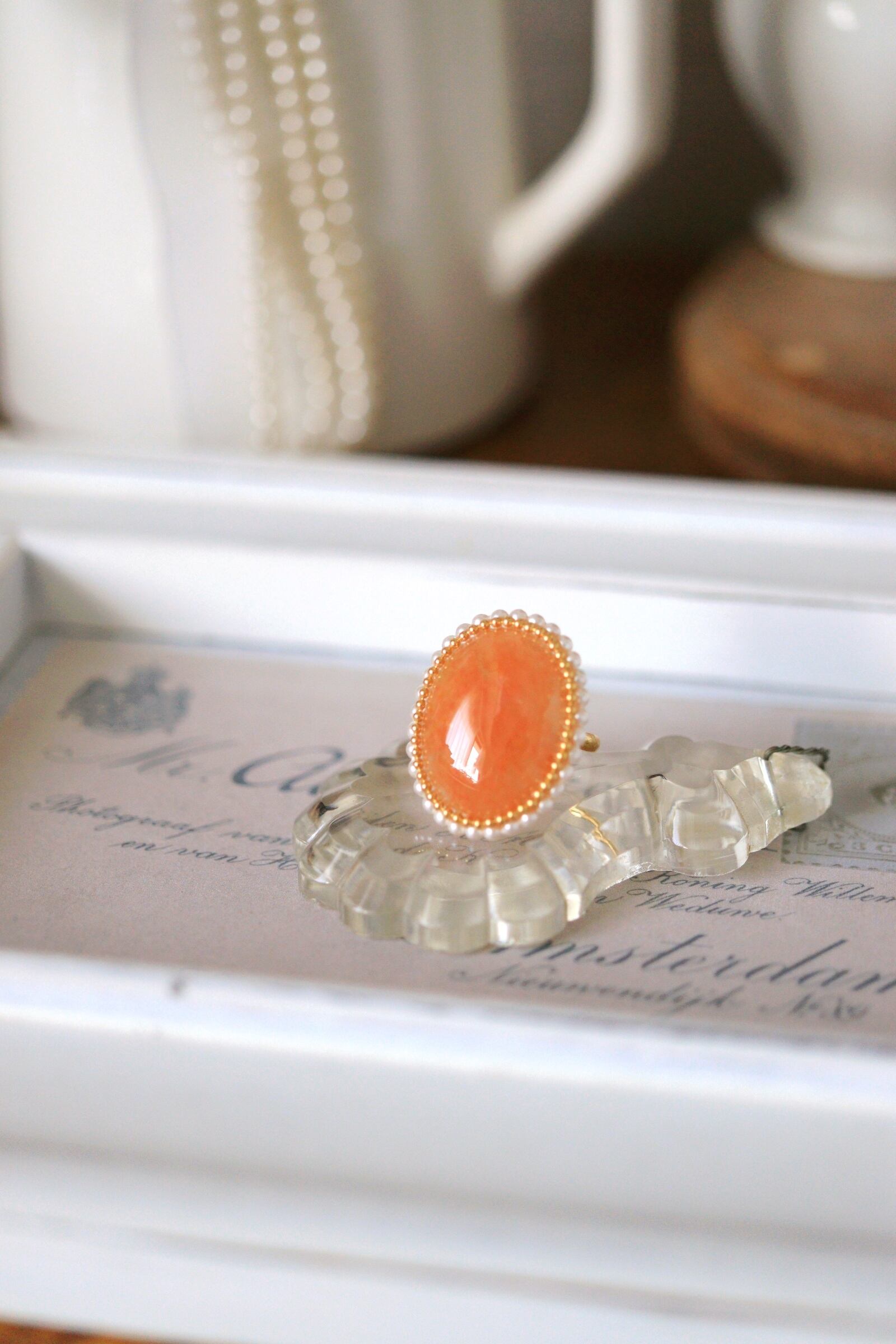 ぷっくりとして、艶感のある石がパールをまといリングになりました。