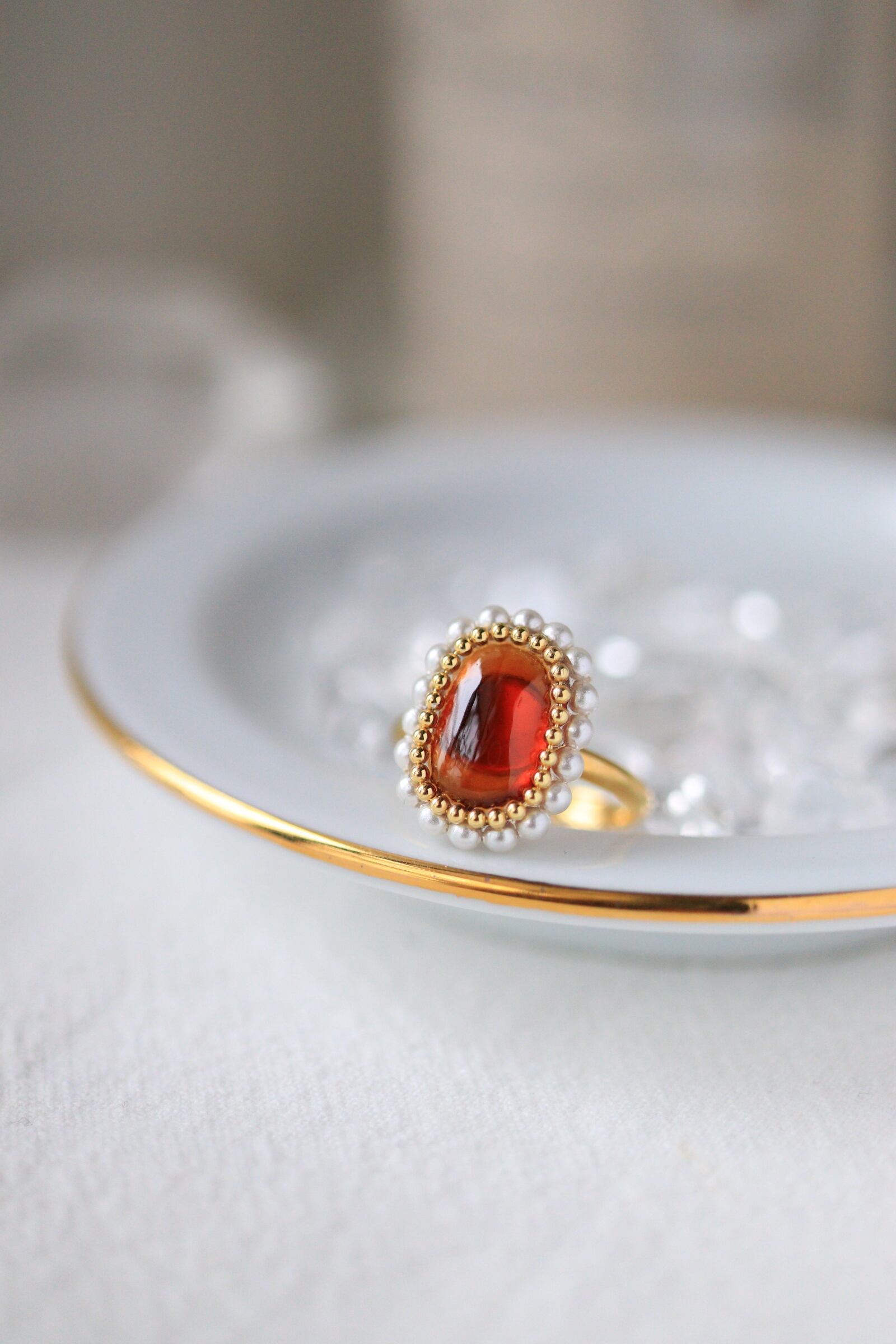 透明感と輝きがあるガーネットがパールをまといリングになりました。