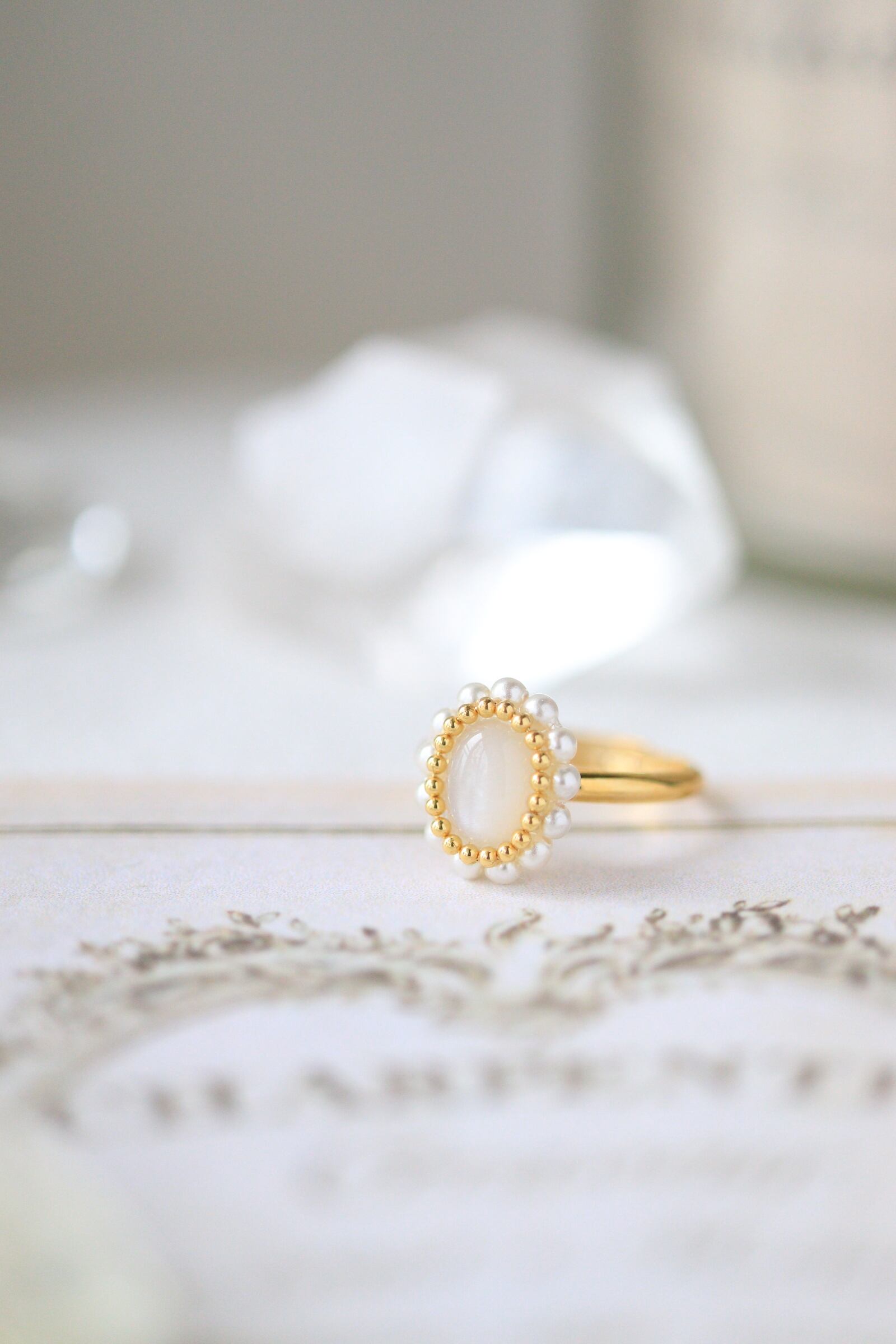 ホワイトパールと金の縁取りが石を更に輝かせ、
