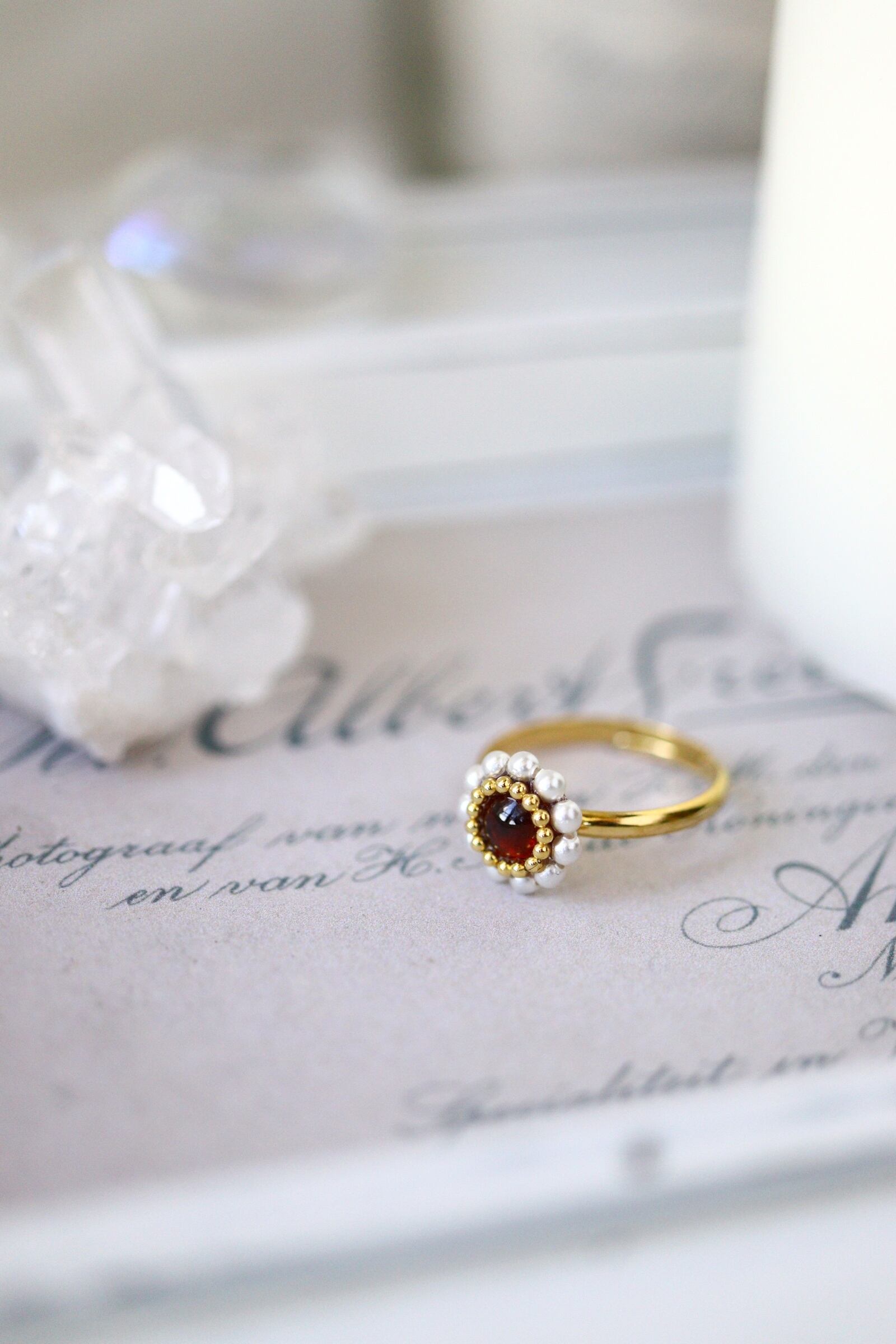 透明感と輝きがあるガーネットがパールをまといリングになりました。