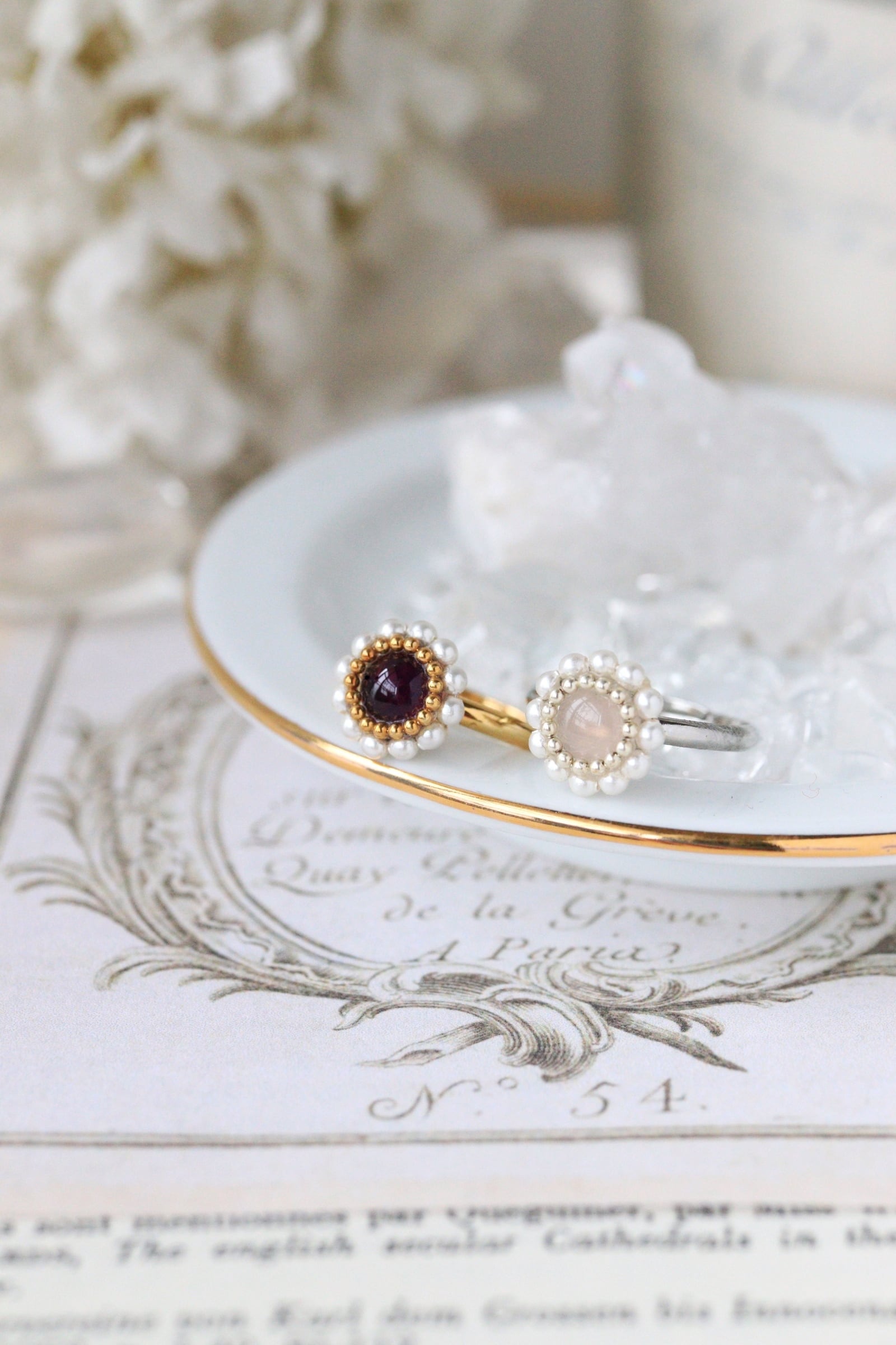 • ローズクォーツ ・パールリング:愛と癒やしの石に、上品なパールを添えて。