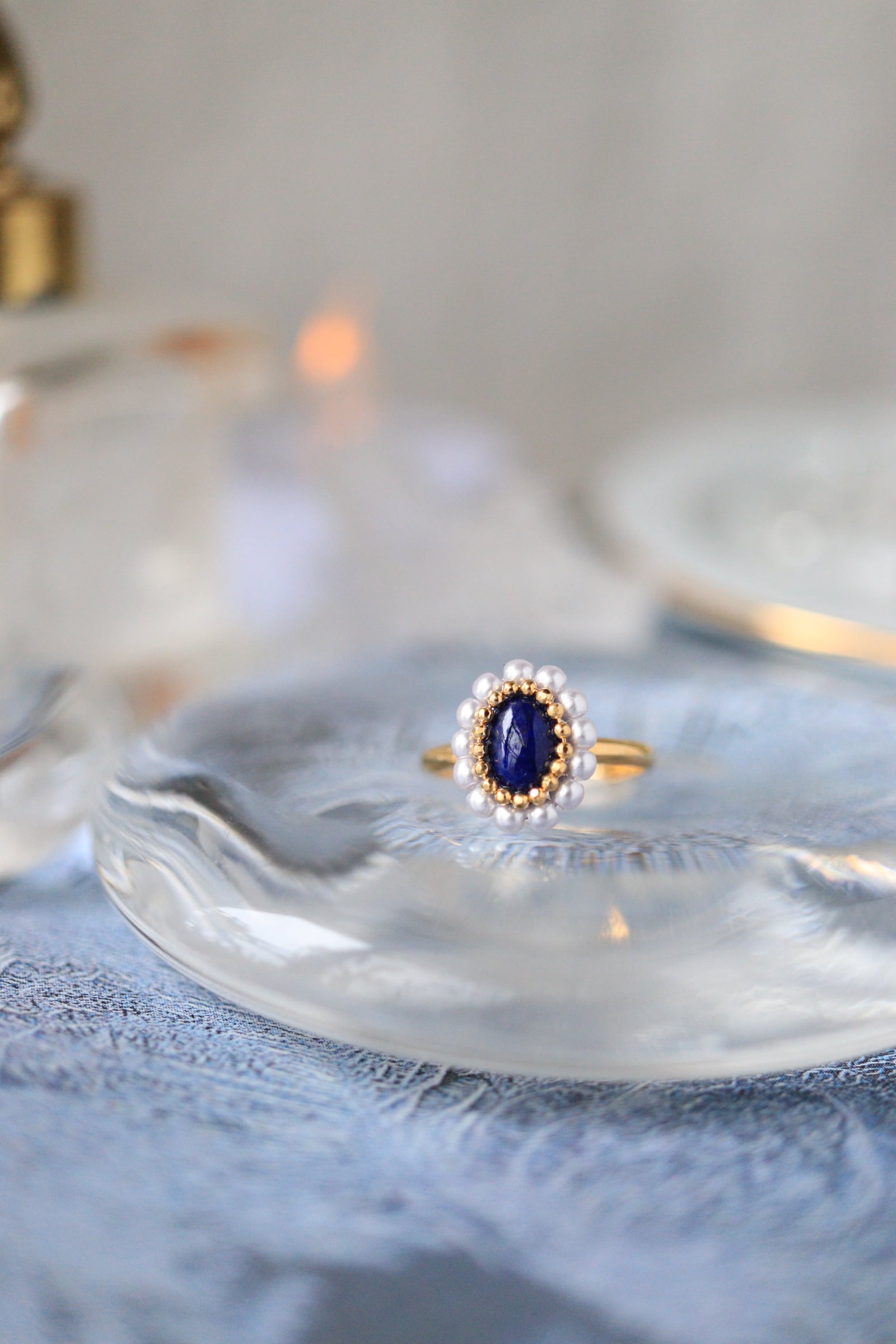 ちゅるんとした質感の石が、光沢の美しいパールとキラキラと輝く縁取りを纏いリングになりました。