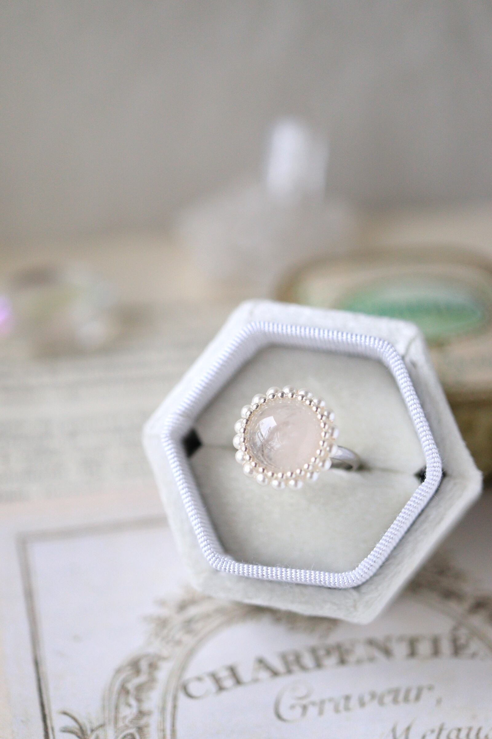 見ているだけで心がほどけるような、優しいピンク色の石が、繊細なパールを纏いリングになりました。