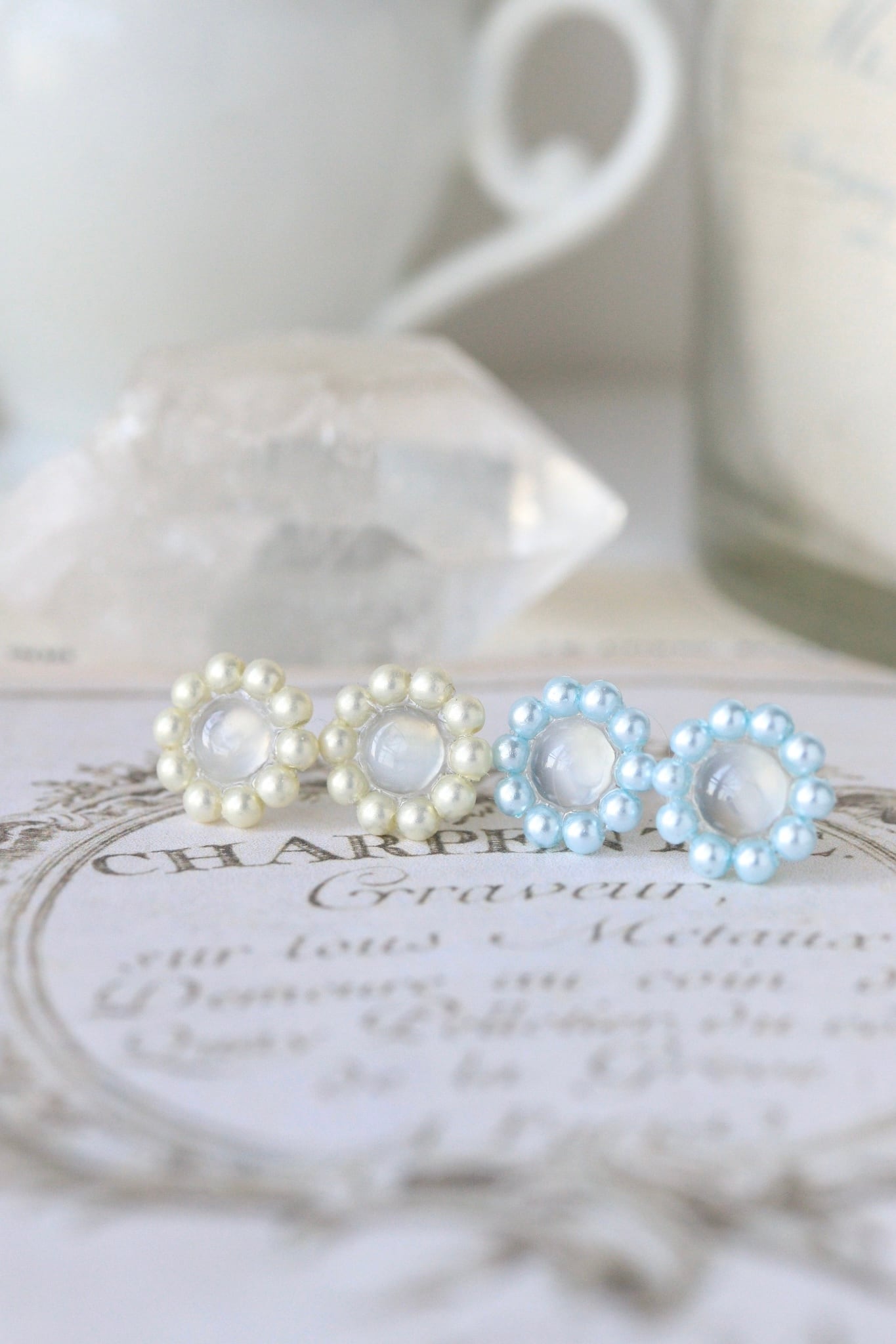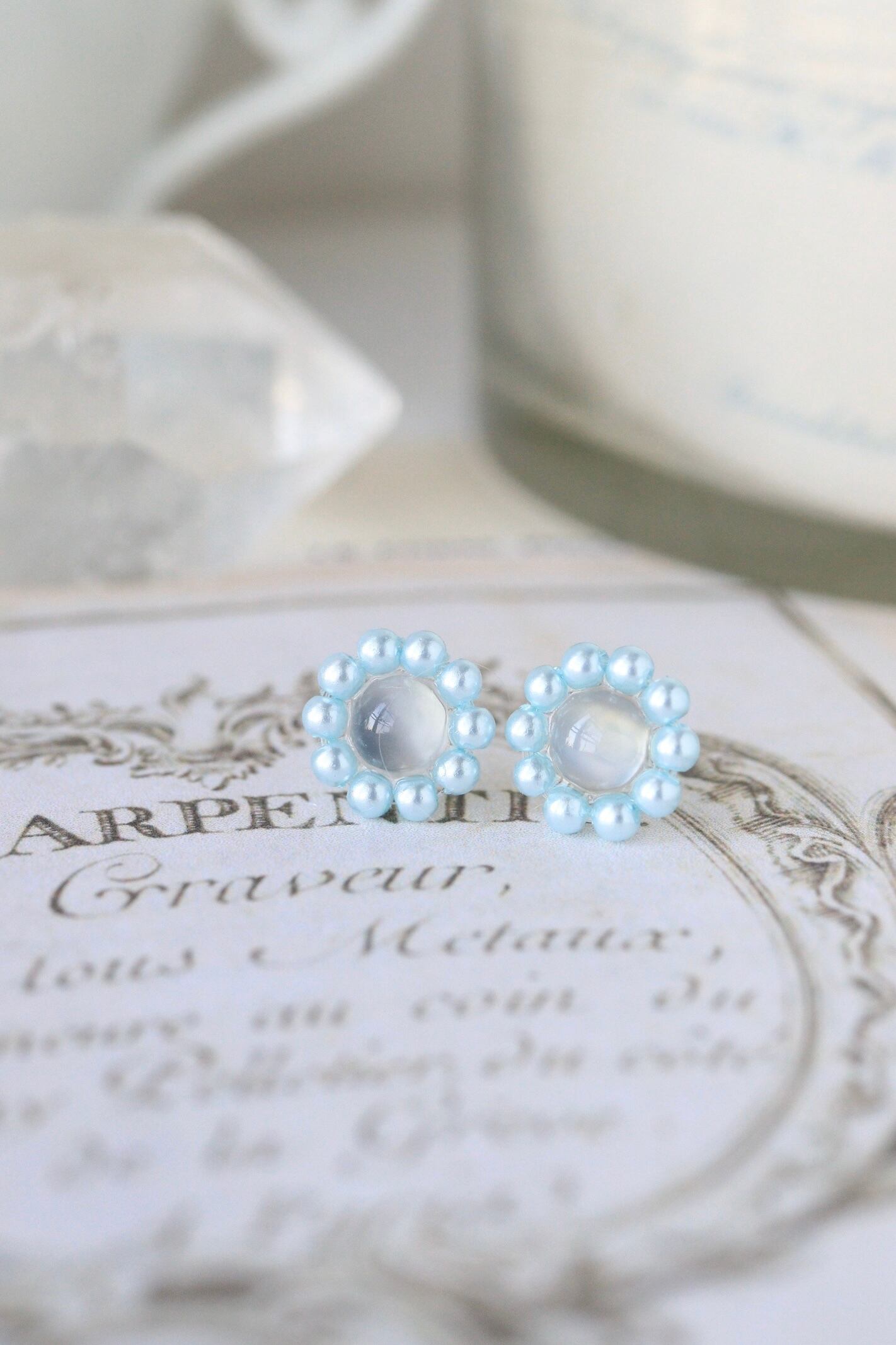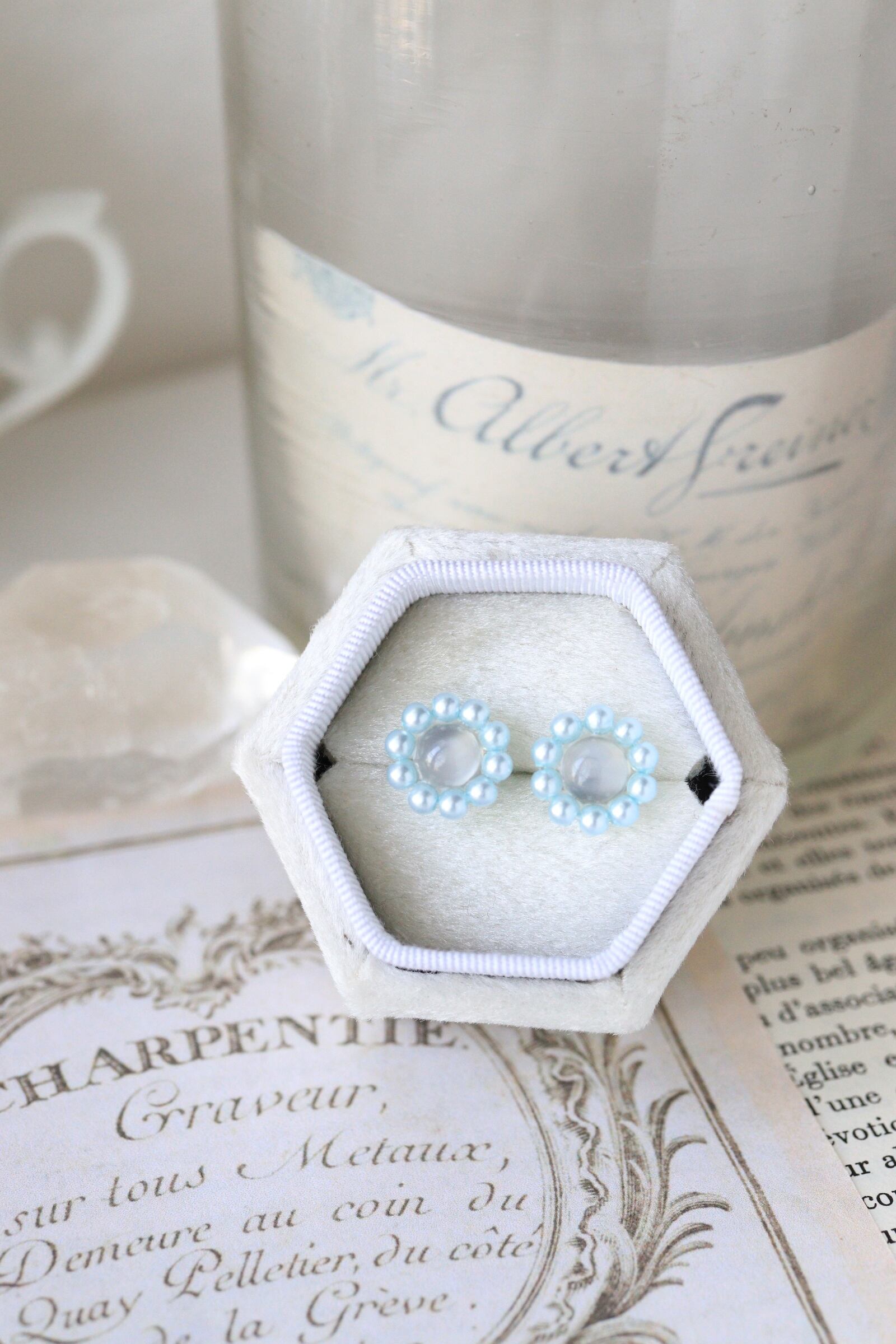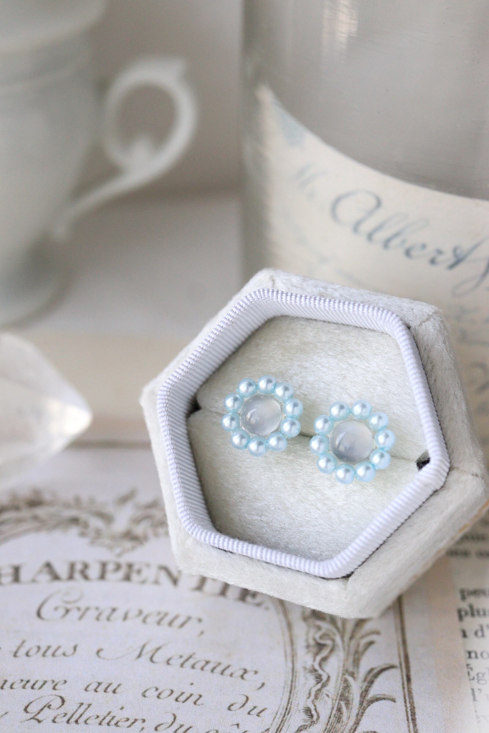 ペールブルーの艶やかなパールを纏ったホワイトムーンストーンがかわいいピアスになりました。