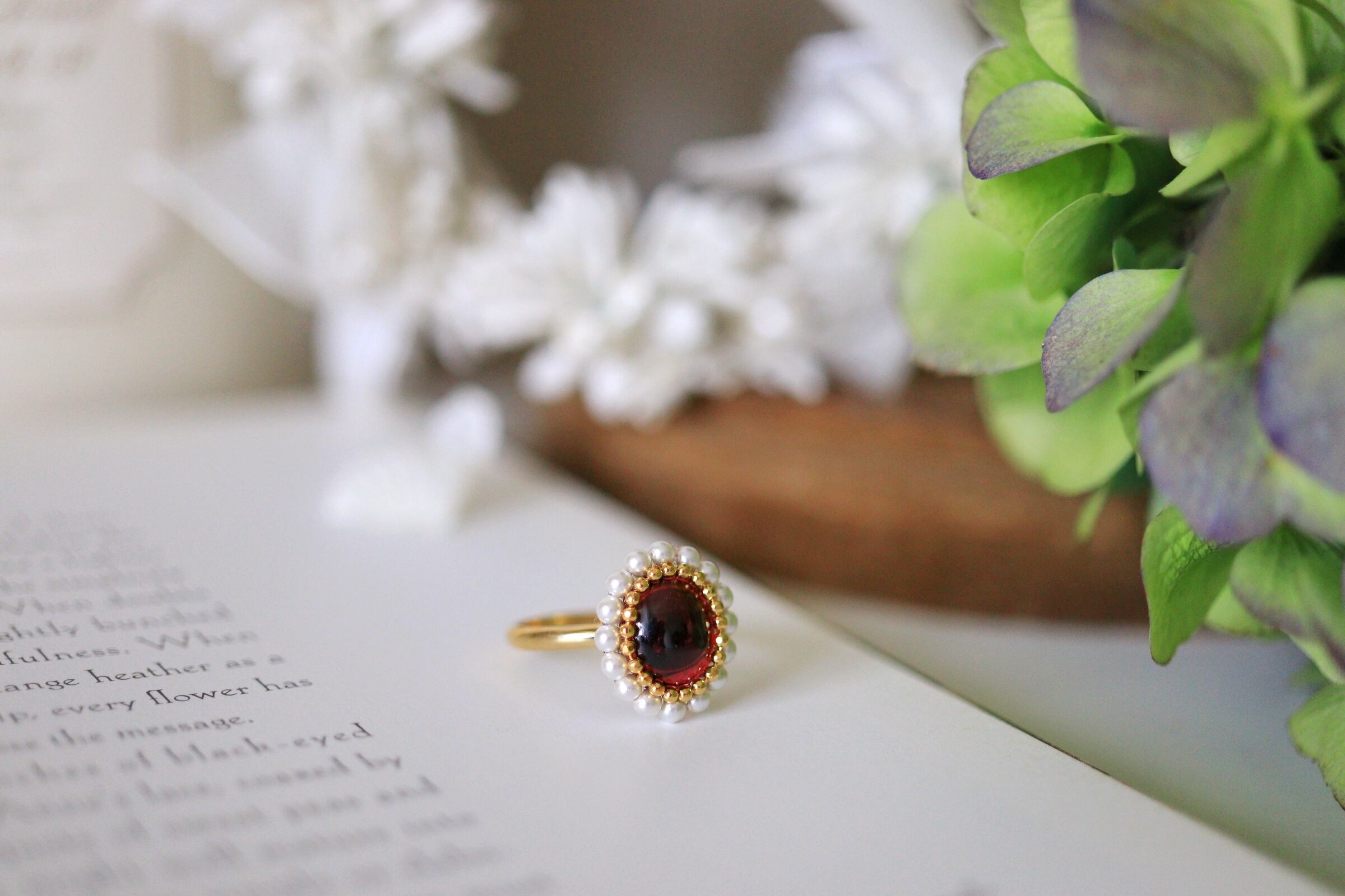透明感があり艶があるガーネットをパールで包みリングにしました
