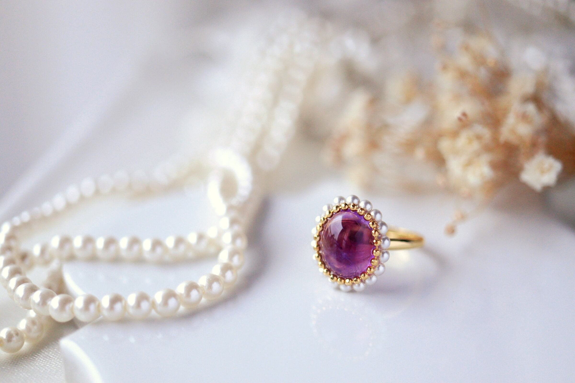 ちゅるんとした様子はキャンディやゼリーのようにも見え、指元で石のみずみずしさが目を引きます。
