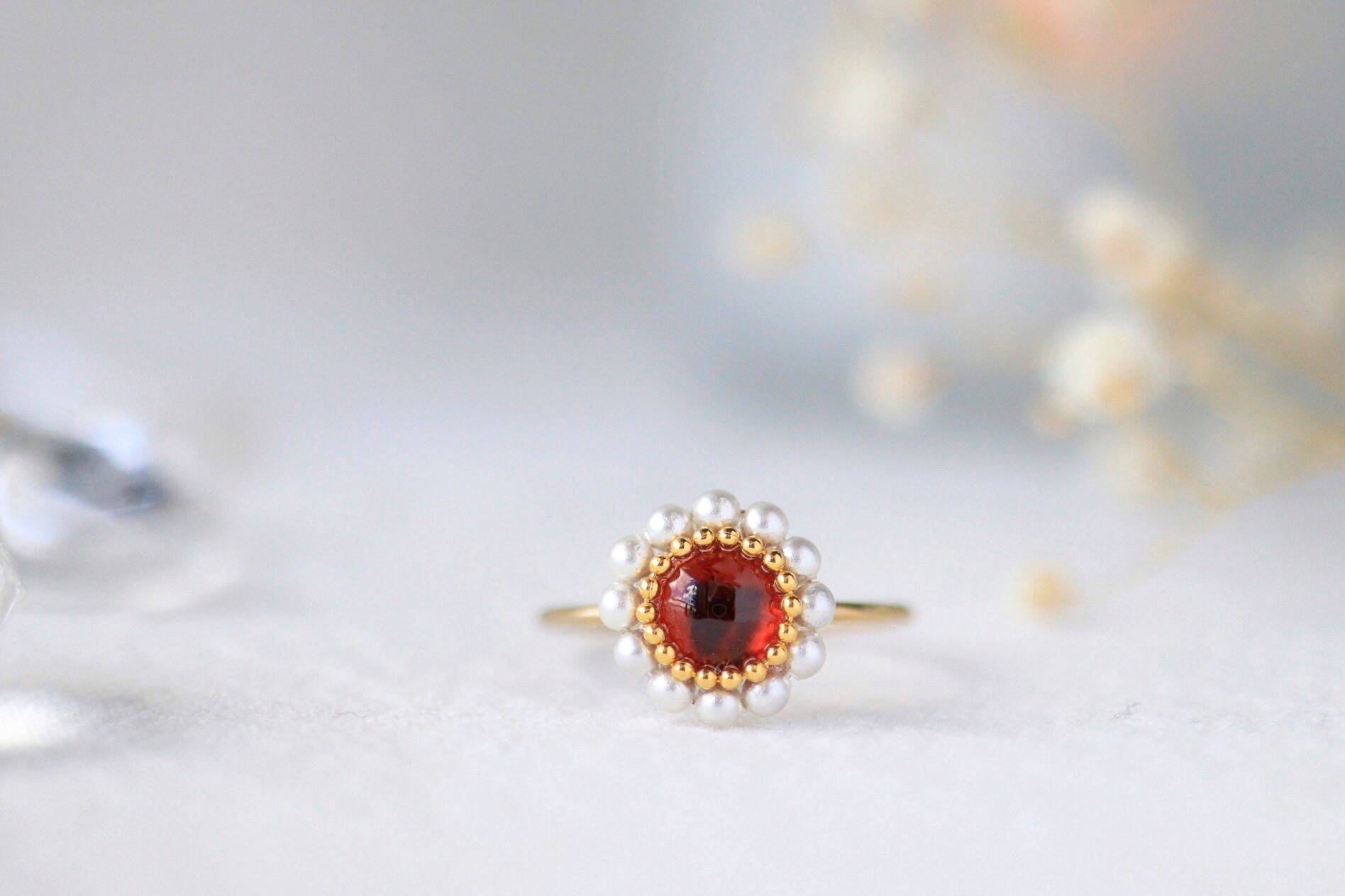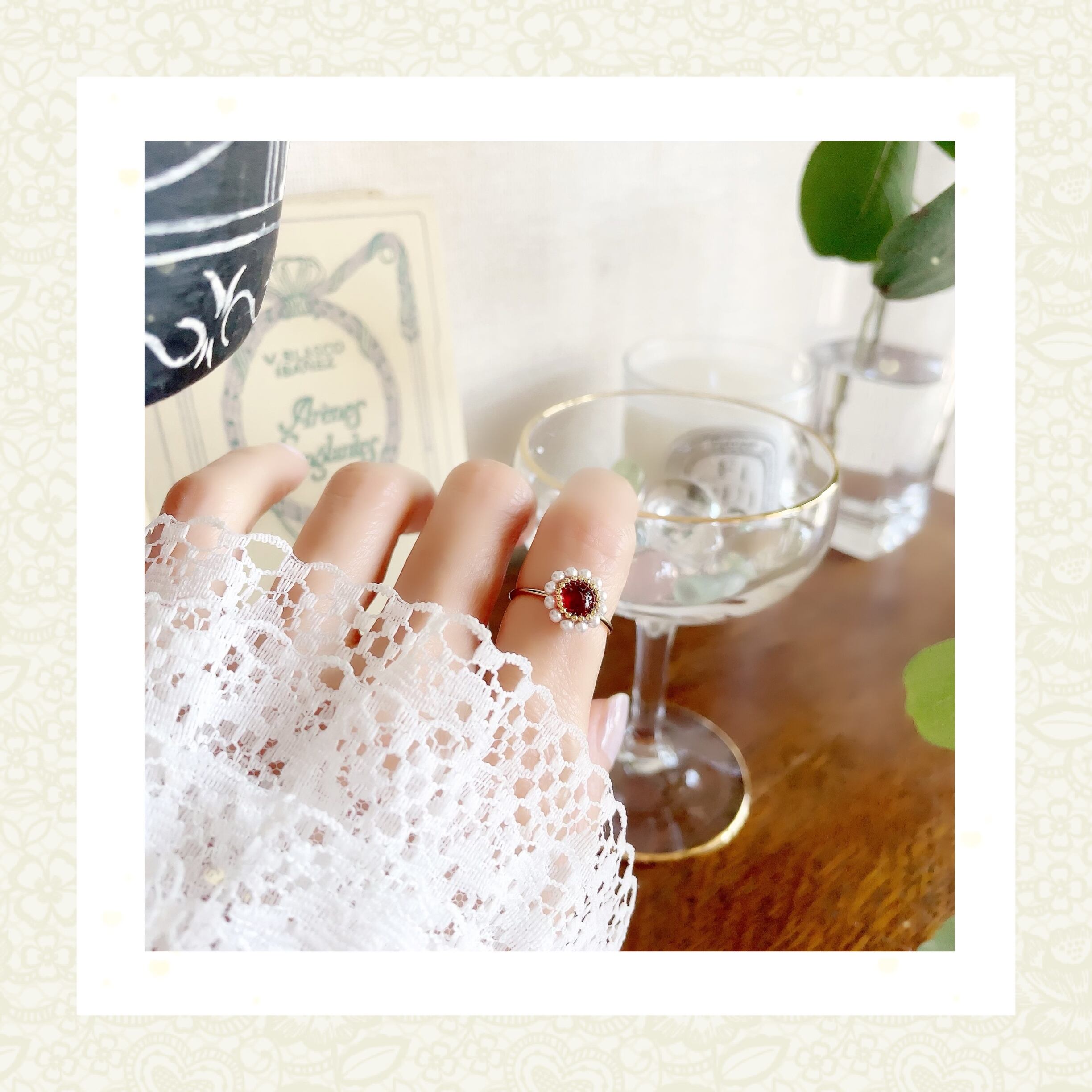 透明感があり艶があるガーネットをパールで包みリングにしました