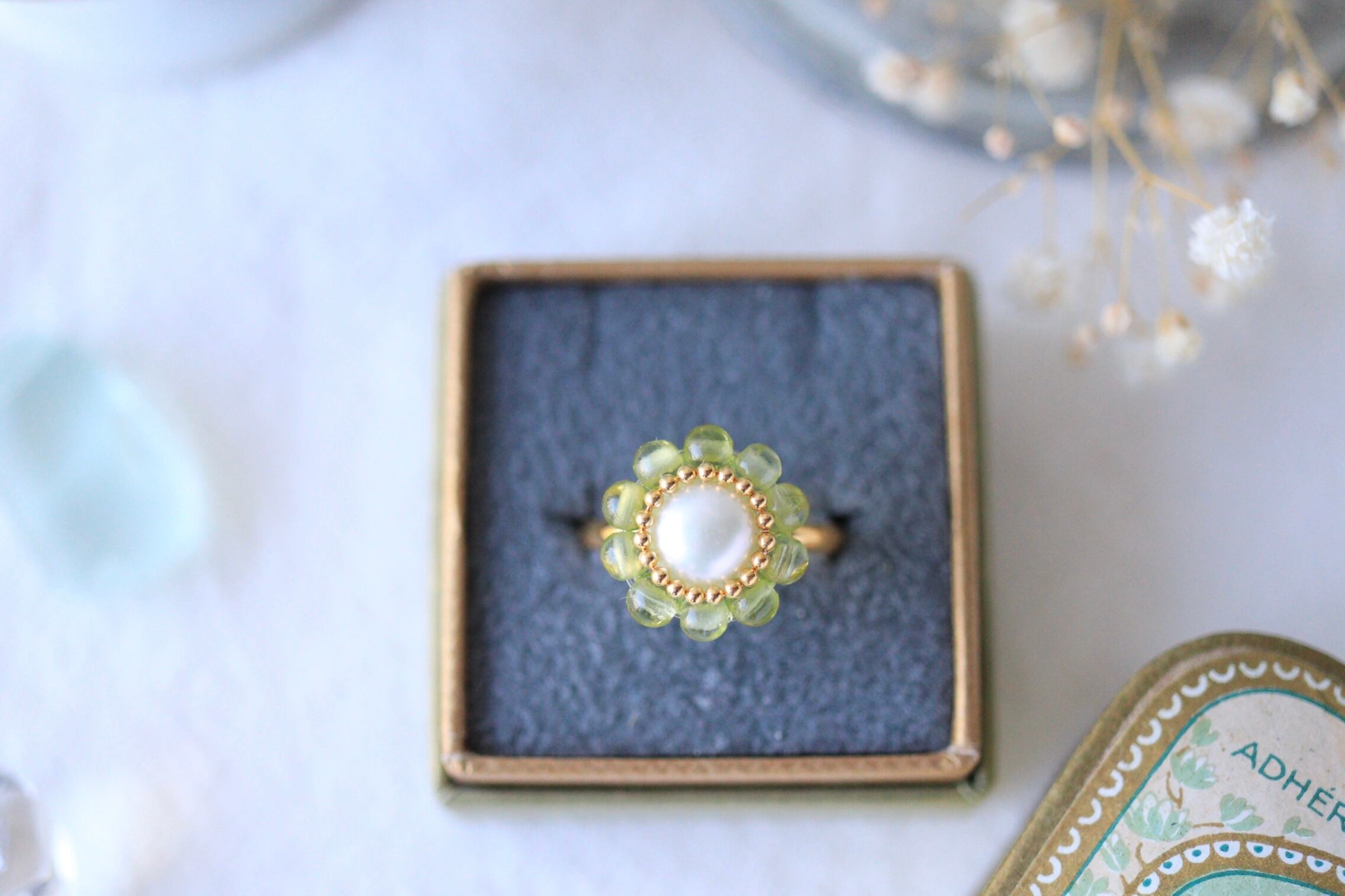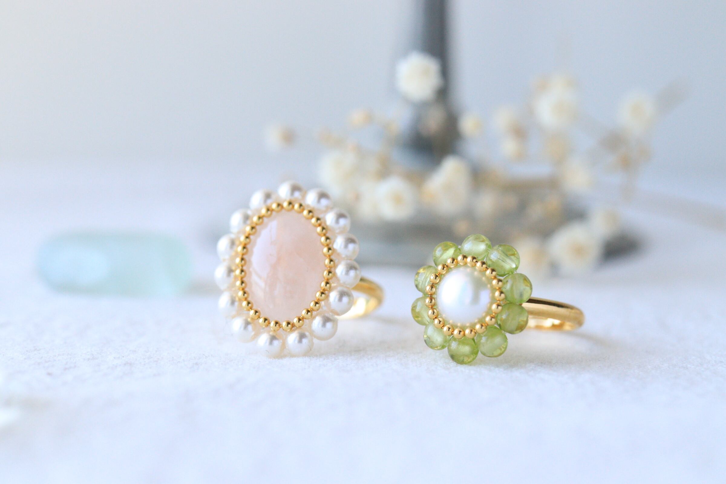 ちゅるんとしたペリドットと柔らかい色合いのパールを使用したビジューリング