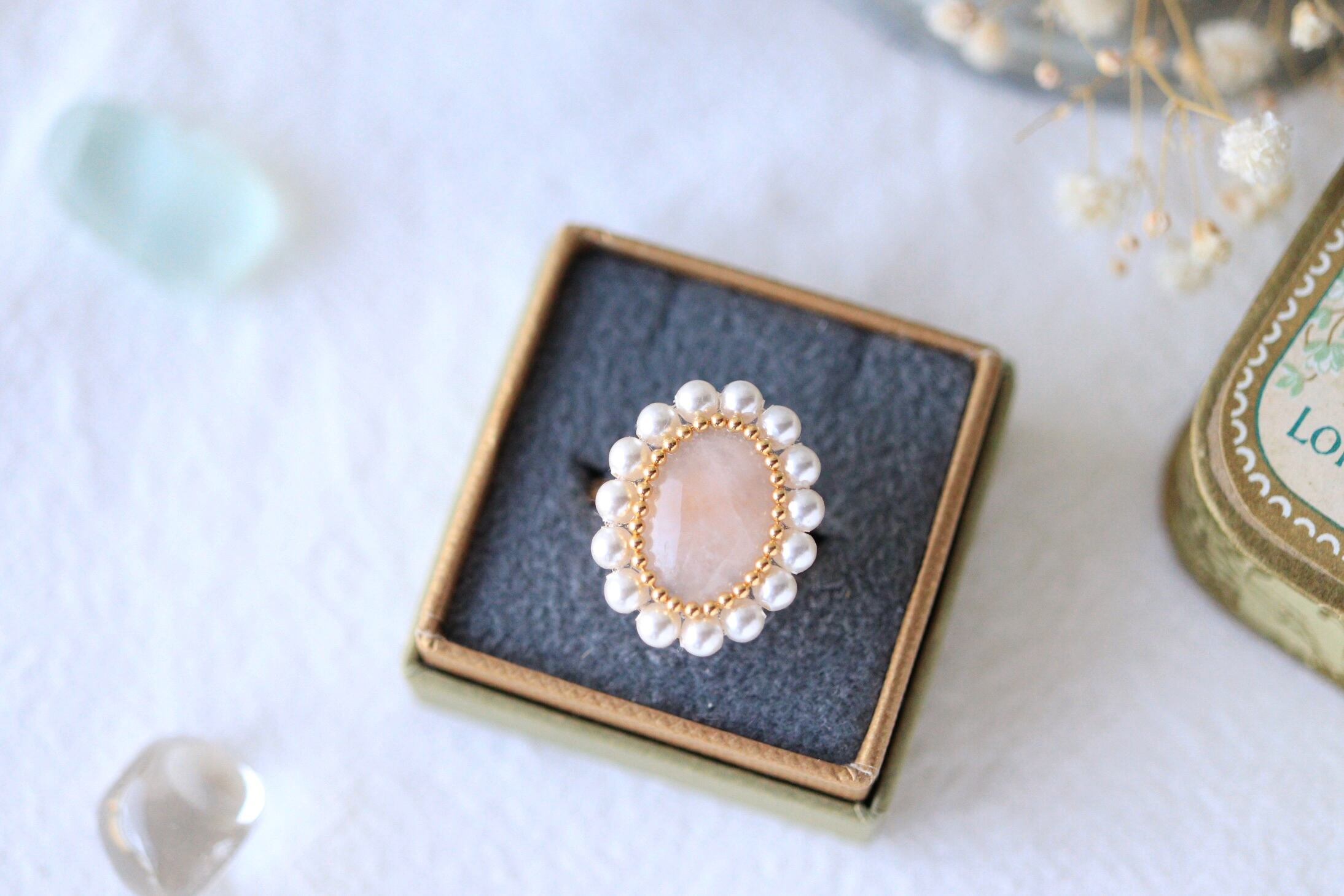 クラシカルなオーバル型、艶感のある石をパールで包みリングに仕上げました。
