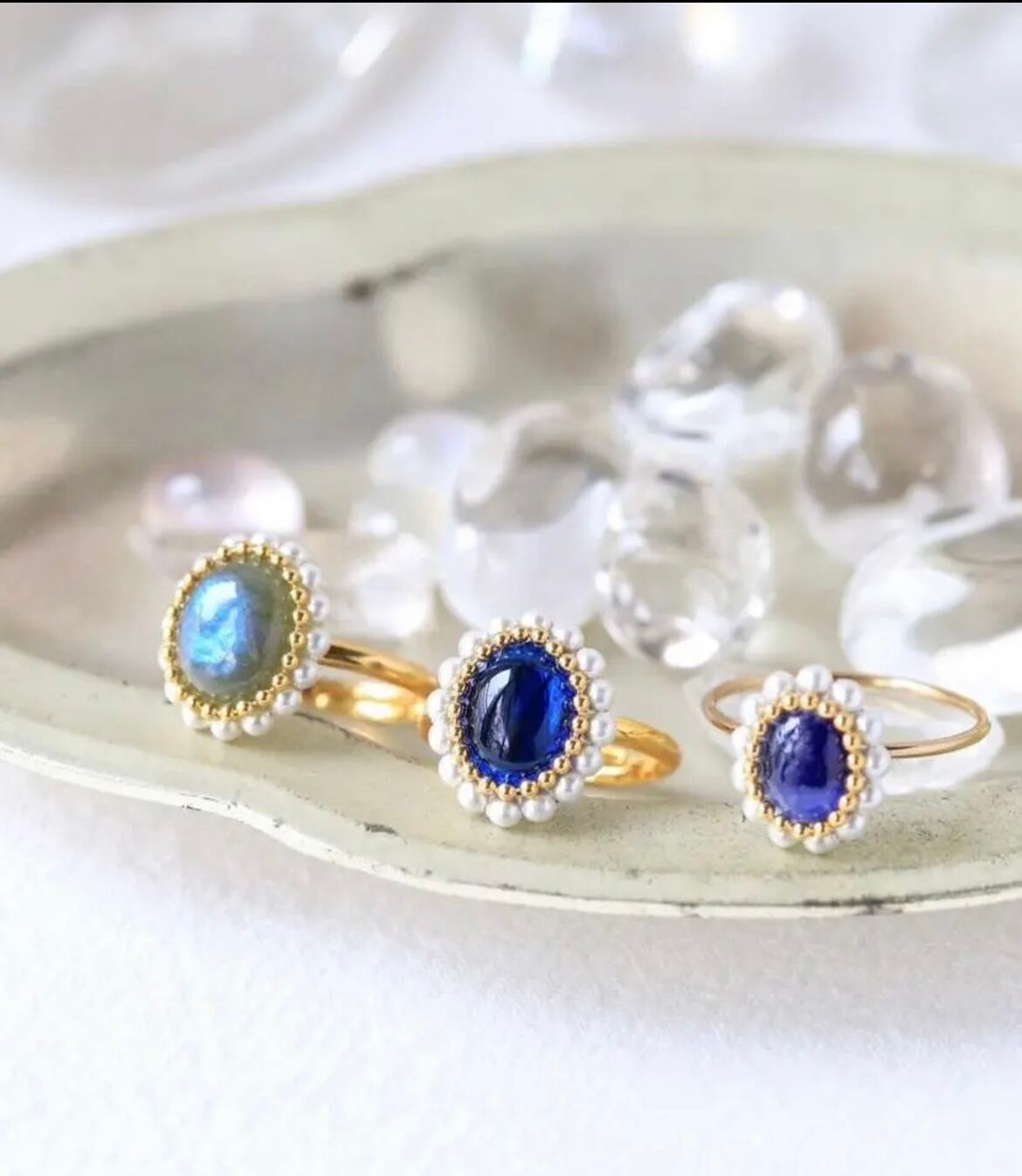 キラリと光るブルーラブラドライトが指元で可憐に輝きます。