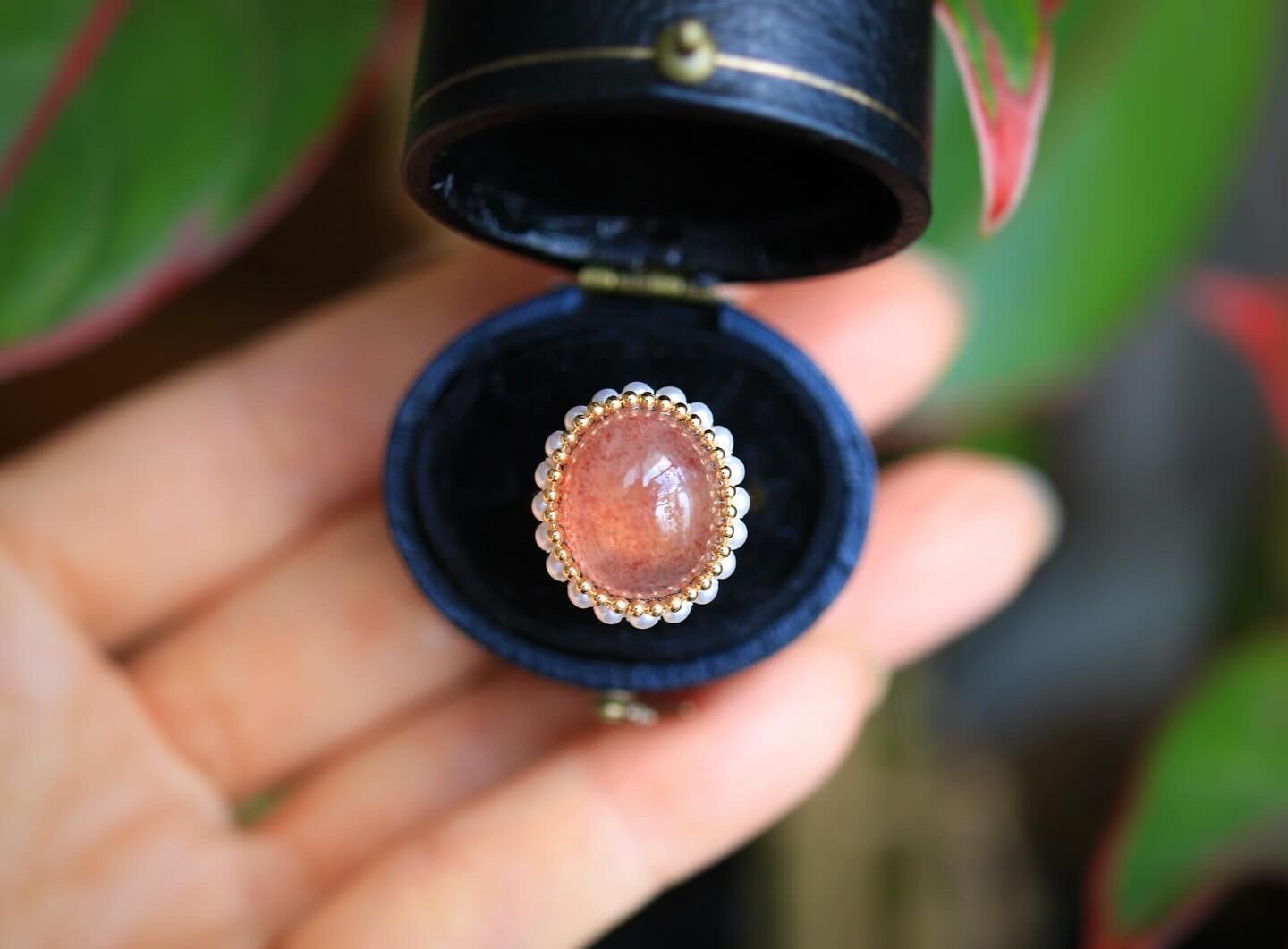 透明感、艶感のある石をパールで包み込みリングを作りました。